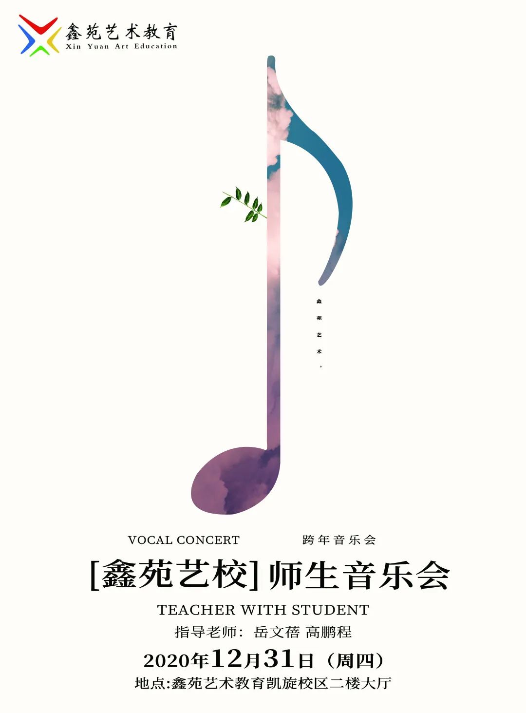 不平凡的2020年即将过去,这一年,我们共同战疫,用音乐坚定同行。鑫苑艺术教育跨年音乐会的号角已吹响,凯歌高奏辞旧岁,在这跨年之际,岳文蓓老师和高鹏程老师携学生登台演唱。新的一年,愿一切困难都能风轻云淡,愿一切美好都能如约而至!