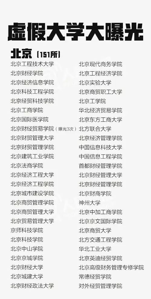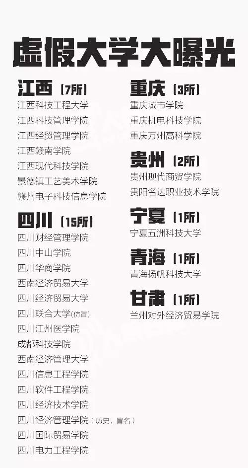 从2013年到2016年共5批虚假大学名单被曝光,一些虚假学校被曝光多次仍换个域名继续存在。这些学校绝大部分仿冒正规高校名称,连学校简介也是抄袭拼凑而来。381所最全名单↓↓转发防止受骗!